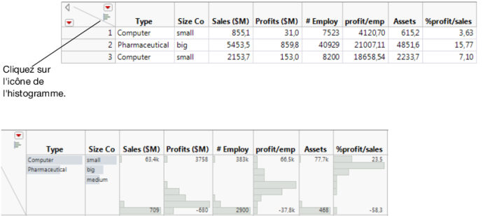 Cet exemple s'appuie sur la table de données Companies.jmp, qui contient des données sur les bénéfices d’un groupe de sociétés.