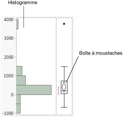 La boîte à moustaches, qui est une autre forme de synthèse graphique des données. Pour plus d'informations sur la boîte à moustaches, voir le chapitre Graph Builder dans Essential Graphing.