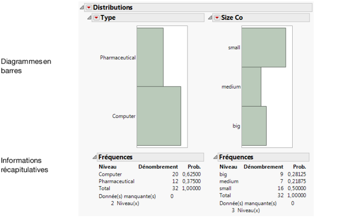 Cet exemple s'appuie sur la table de données Companies.jmp, qui contient des données sur la taille et le type d’un groupe de sociétés.