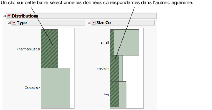 Supposons que vous souhaitiez voir la distribution de la taille des laboratoires pharmaceutiques. Cliquez sur la barre Pharmaceutical du diagramme Type pour que les laboratoires pharmaceutiques soient mis en surbrillance dans le diagramme Size Co. La Figure 4.8 Cliquer sur les barres montre que, bien que la plupart des sociétés de cette table soient de petite taille, la plupart des laboratoires pharmaceutiques sont de moyenne ou grande taille.