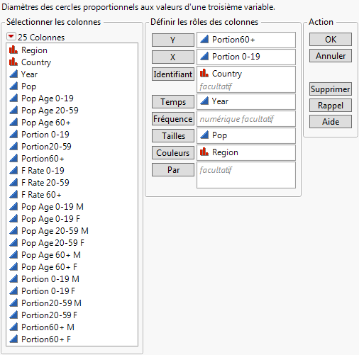 Cliquez sur le bouton de lecture/arrêt pour animer le graphique en bulles. Notez qu'au fil du temps, la proportion des moins de 20 ans (Portion 0-19) diminue au profit des plus de 60 ans (Portion60+).