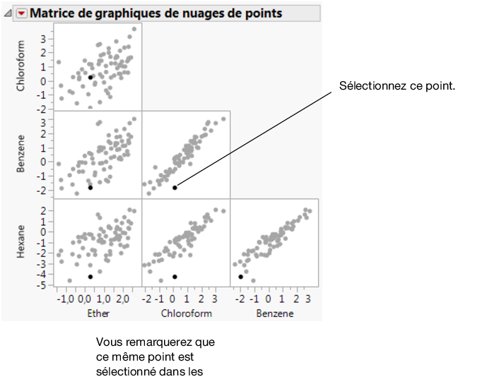 Par exemple, si vous sélectionnez un point dans le nuage Benzene / Chloroform, il est également sélectionné dans les cinq autres graphiques.