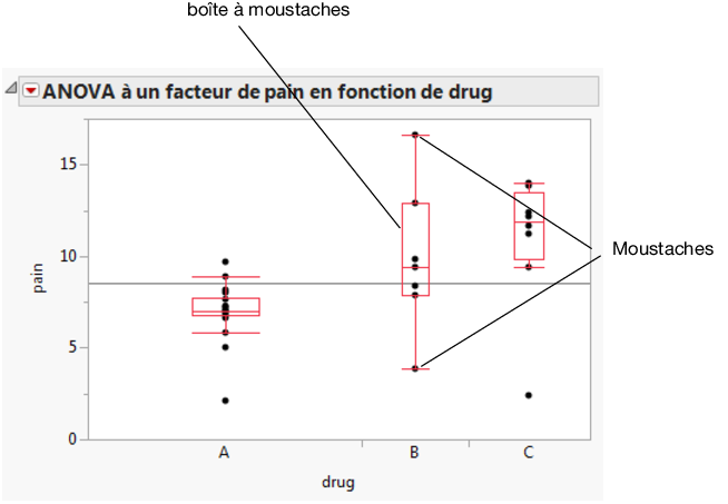 Cliquez sur le triangle rouge situé en regard d'ANOVA à un facteur de Pain en fonction de Drug et sélectionnez Options d'affichage > Boîtes à moustaches.