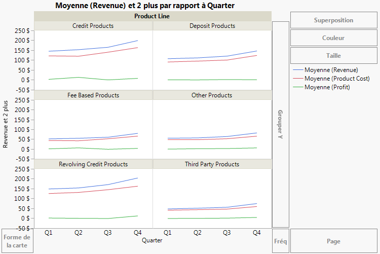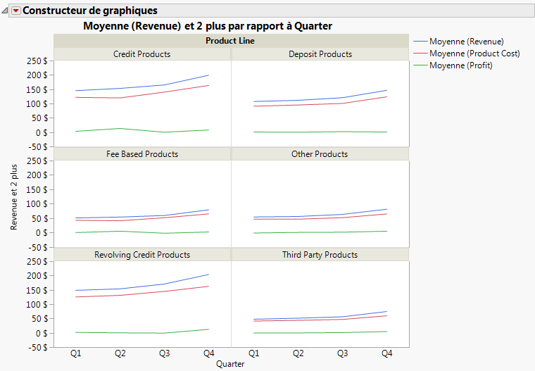 La Figure 4.25 Graphiques en courbes finaux affiche les recettes, le coût et les bénéfices par ligne de produits. L’analyste commercial souhaitait voir la différence de rentabilité entre les lignes de produits. Les courbes de la Figure 4.25 Graphiques en courbes finaux apportent quelques éléments de réponse :