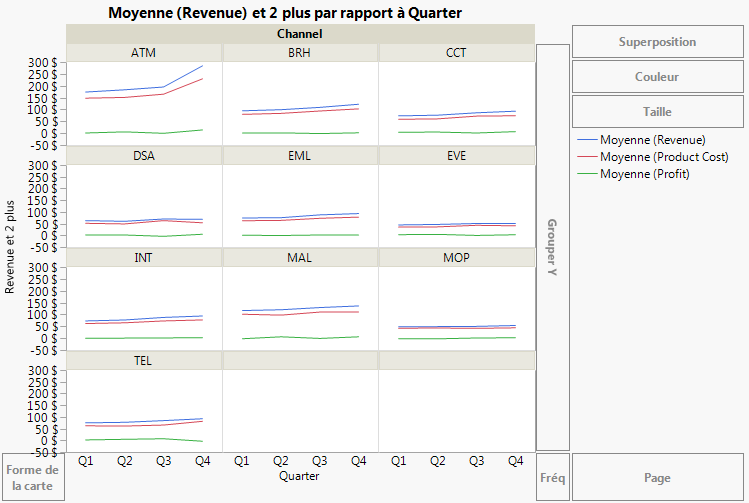 La Figure 4.26 Graphiques en courbes affichant les réseaux de ventes apporte l'éclairage suivant : ce sont les ATM qui présentent les recettes et coûts de produit les plus élevés, et la croissance la plus rapide.