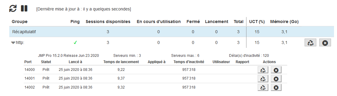 Le récapitulatif, en haut, vous montre combien de sessions JMP sont disponibles, en cours d'utilisation, closes ou en cours de lancement, et le nombre total de sessions JMP dont vous disposez. Vous pouvez aussi voir des statistiques de CPU et de mémoire vous informant de l'activité des sessions.