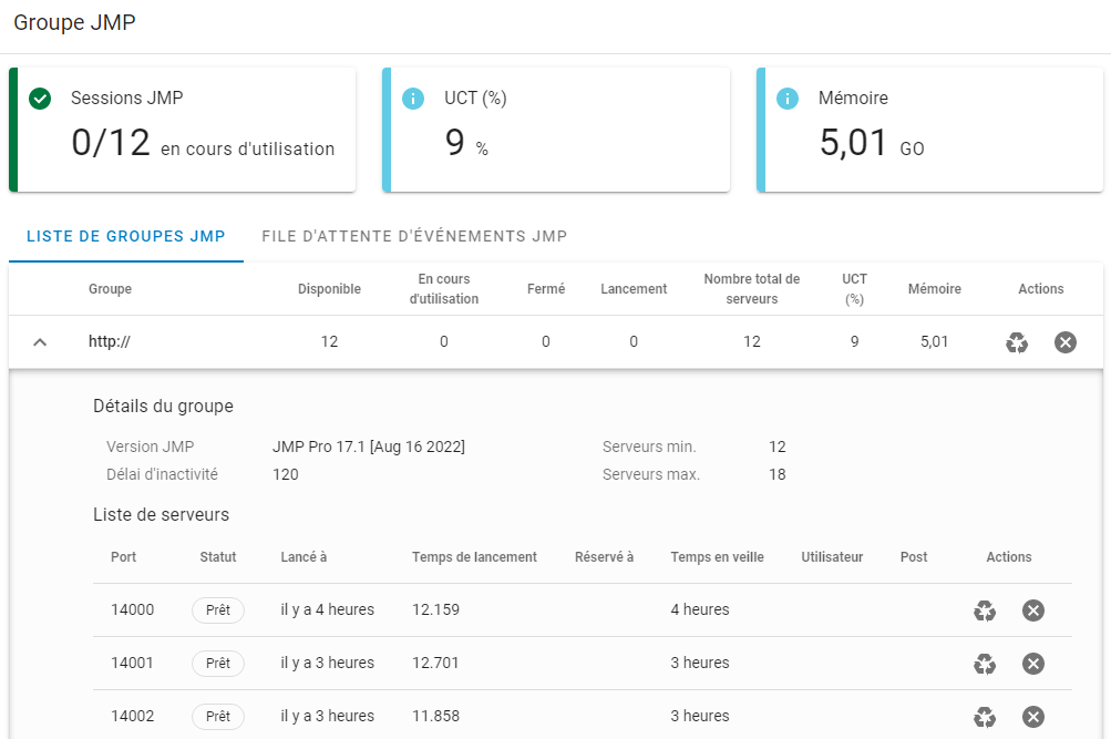 Dans JMP Live, un groupe JMP a un certain nombre de sessions JMP exécutées sur différents ports. Vous pouvez suivre le statut des événements et des groupes JMP sous Admin > Statut du groupe JMP