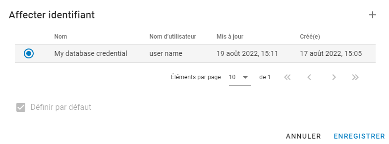 Ajoutez un nom d'identification pour les informations d'identification, ainsi que votre identifiant utilisateur et votre mot de passe pour la base de données. Pour plus de détails, voir Affecter des informations d'identification.