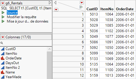 Utilisez le Générateur de requêtes pour importer les données dans une table de données JMP. Pour plus de détails, voir la section sur la construction de requêtes SQL dans le livre Utilisation de JMP.