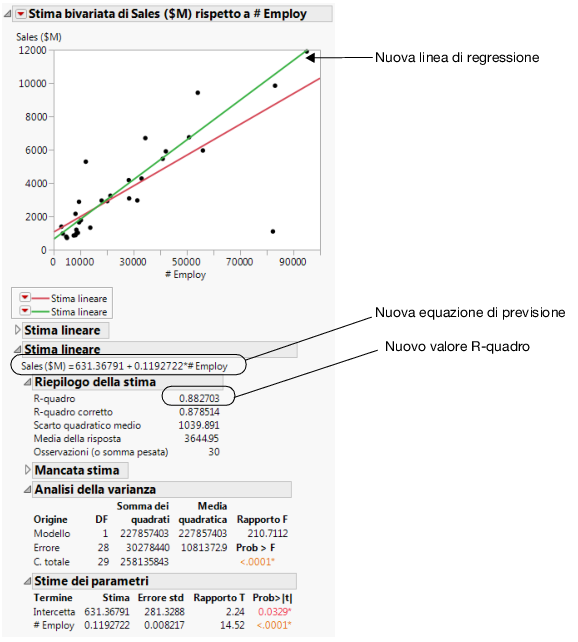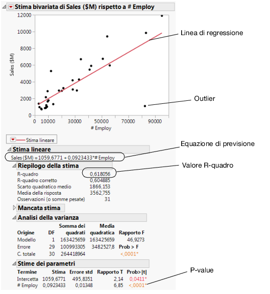 Per prevedere i ricavi derivanti dalle vendite dal numero dei dipendenti, stimare un modello di regressione. Dal triangolo rosso di Stima bivariata, selezionare Stima lineare. Una linea di regressione viene aggiunta al grafico a dispersione e vengono aggiunti report alla finestra dei report.