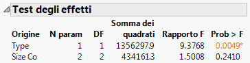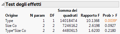 Il report Test degli effetti (vedere Figura 5.24) mostra i risultati dei test statistici. Esiste un test per ognuno degli effetti inclusi nel modello nella finestra Stima modello: Type, Size Co e Type*Size Co.