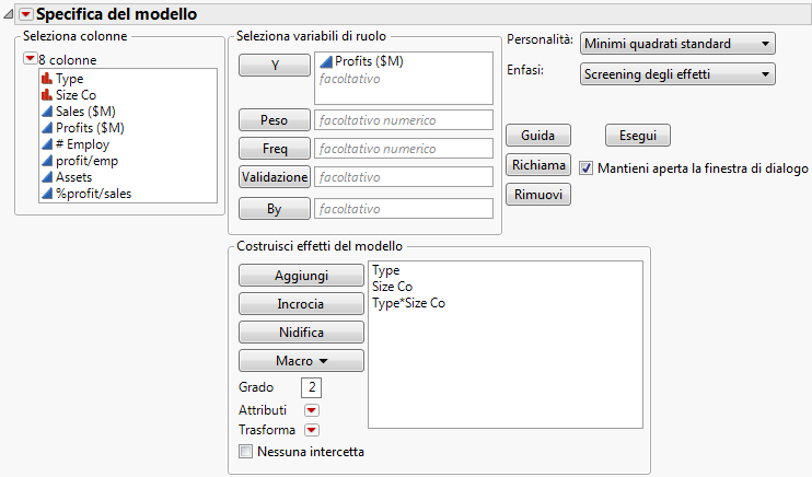 Nella casella Costruisci effetti del modello, selezionare l'effetto Type*Size Co e fare clic su Rimuovi.