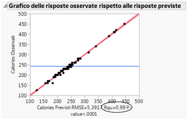 Un'altra misura della precisione del modello è il valore R-quadro (che appare sotto il grafico in Figura 5.28). Il valore R-quadro misura la percentuale di variabilità in calorie, come spiegato dal modello. Quanto più il valore si avvicina a 1 tanto più un modello fa previsioni corrette. In questo esempio, il valore R-quadro è 0.99.