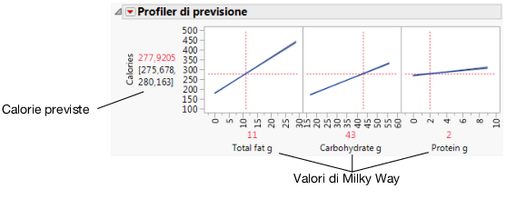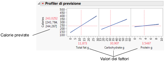 Utilizzare il Profiler di previsione per osservare quali cambiamenti nei fattori influiscono sui valori previsti. Le linee del profilo mostrano la grandezza di cambiamento nelle calorie al variare dei fattori. La linea di Total fat g è la più verticale, per indicare che i cambiamenti nel grasso totale hanno gli effetti più ampi sulle calorie.