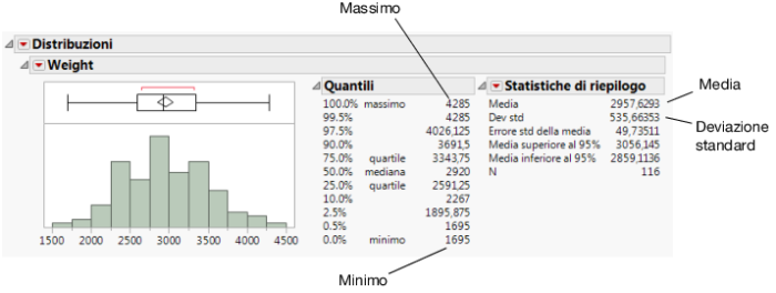 Questo esempio utilizza la tabella di dati Car Physical Data.jmp, che contiene informazioni su circa 116 modelli diversi di automobili.