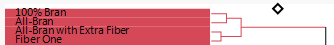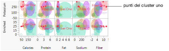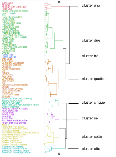 La clusterizzazione è una tecnica multivariata che raggruppa osservazioni che condividono valori simili di un certo numero di variabili. La clusterizzazione gerarchica unisce righe in una sequenza gerarchica ritratta come un albero. I cereali con alcune caratteristiche, come quelli a elevato contenuto di fibre, sono raggruppati in cluster in modo da poter visualizzare le similarità tra di loro.