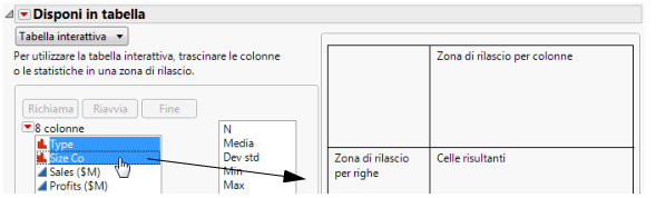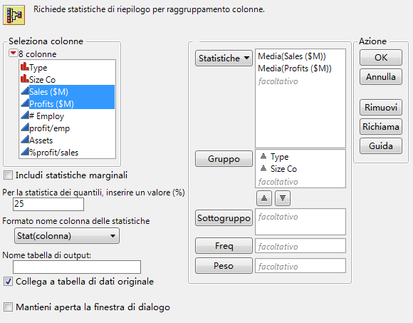 JMP calcola la media di Sales ($M) e la media di Profit ($M) per ogni combinazione di Type e Size Co.