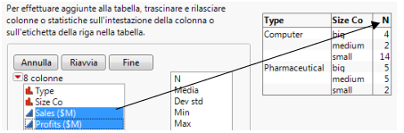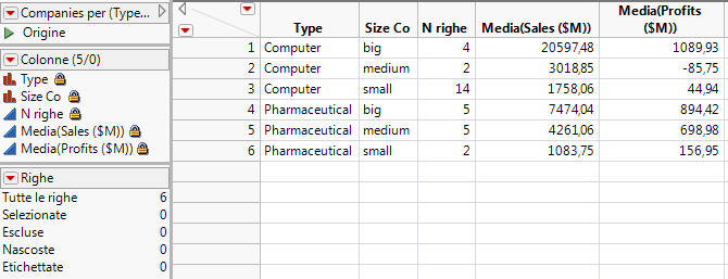 La colonna N righe mostra il numero di righe dalla tabella originale che corrisponde a ogni combinazione delle variabili di raggruppamento. Per esempio, la tabella di dati originale contiene 14 righe corrispondenti ad aziende di informatica di piccole dimensioni.