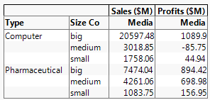 È presente una colonna per ogni statistica di riepilogo richiesta. In questo esempio, è presente una colonna per la media di Sales ($M) e una colonna per la media di Profits ($M).