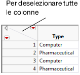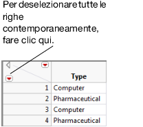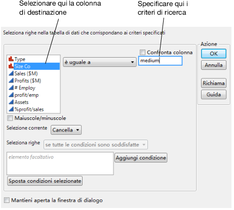 JMP seleziona tutte le righe che hanno Size Co uguale a medium. Sono in tutto sette.