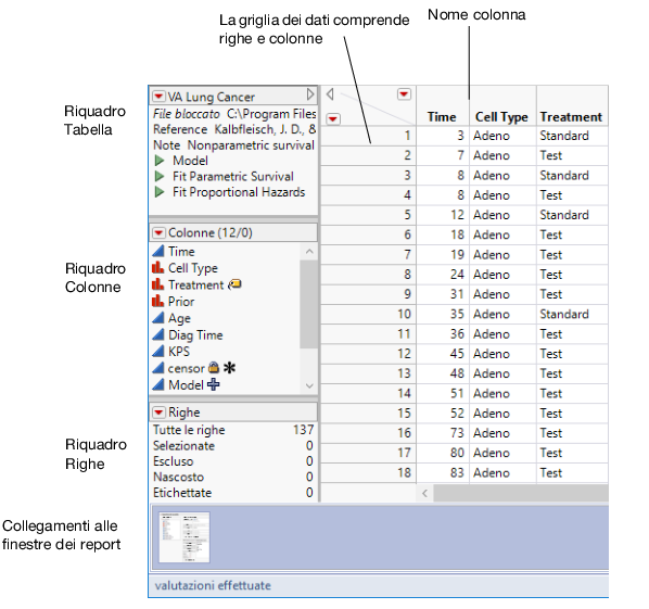 Il riquadro Righe mostra il numero di righe presenti nella tabella di dati e quante righe sono selezionate, escluse, nascoste o etichettate. Nella Figura 2.4 sono presenti 137 righe nella tabella di dati.
