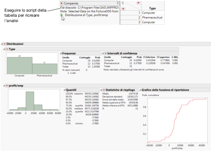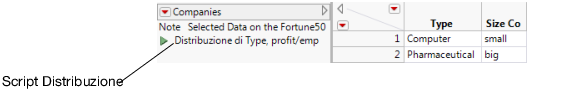 Per salvare questa analisi, selezionare Salva script > In tabella di dati dal menu associato al triangolo rosso di Distribuzioni. Il nuovo script compare nel riquadro della tabella.