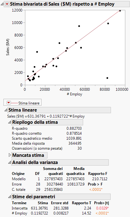 Applicare una linea di regressione selezionando Stima lineare dal menu associato al triangolo rosso. La Figura 8.4 mostra la linea di regressione e i risultati dell'analisi aggiunti alla finestra dei report.