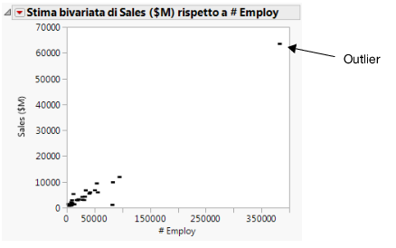 Selezionare Righe > Escludi/Annulla esclusione. Il punto viene escluso dall'analisi e il grafico a dispersione si aggiorna automaticamente.