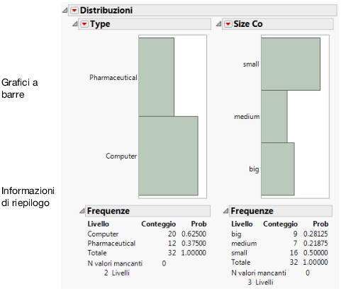 Questo esempio utilizza la tabella di dati Companies.jmp, che contiene dati sulla dimensione e sul tipo di un gruppo di società.