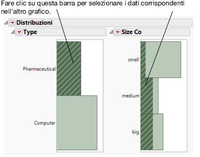Per esempio, supponiamo di voler visualizzare la distribuzione delle dimensioni delle società farmaceutiche. Fare clic sulla barra Pharmaceutical nel grafico a barre Type e le società farmaceutiche vengono evidenziate sul grafico a barre Size Co. La Figura 4.7 mostra che, nonostante la maggior parte delle società in questa tabella di dati siano di piccole dimensioni, la maggior parte delle società farmaceutiche è di medie o grandi dimensioni.
