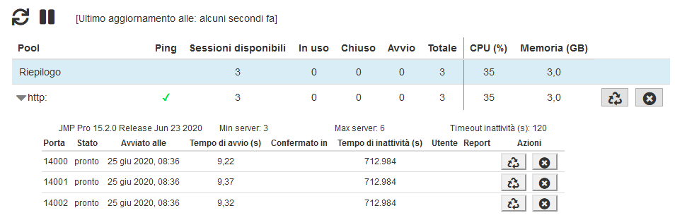 Il riepilogo in alto mostra quante sessioni di JMP sono disponibili, in uso, chiuse o in fase di avvio, e quante sessioni di JMP sono presenti in totale. È possibile visualizzare anche le statistiche della CPU e della memoria che indicano quanto sono occupate le sessioni.