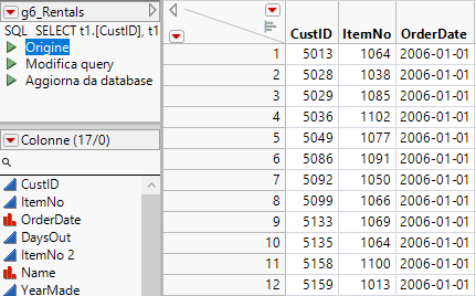 Utilizzare il Costruttore di query per importare i dati da un database in una tabella di dati JMP. Per maggiori dettagli, consultare la sezione sulla costruzione di query SQL nel manuale Using JMP.