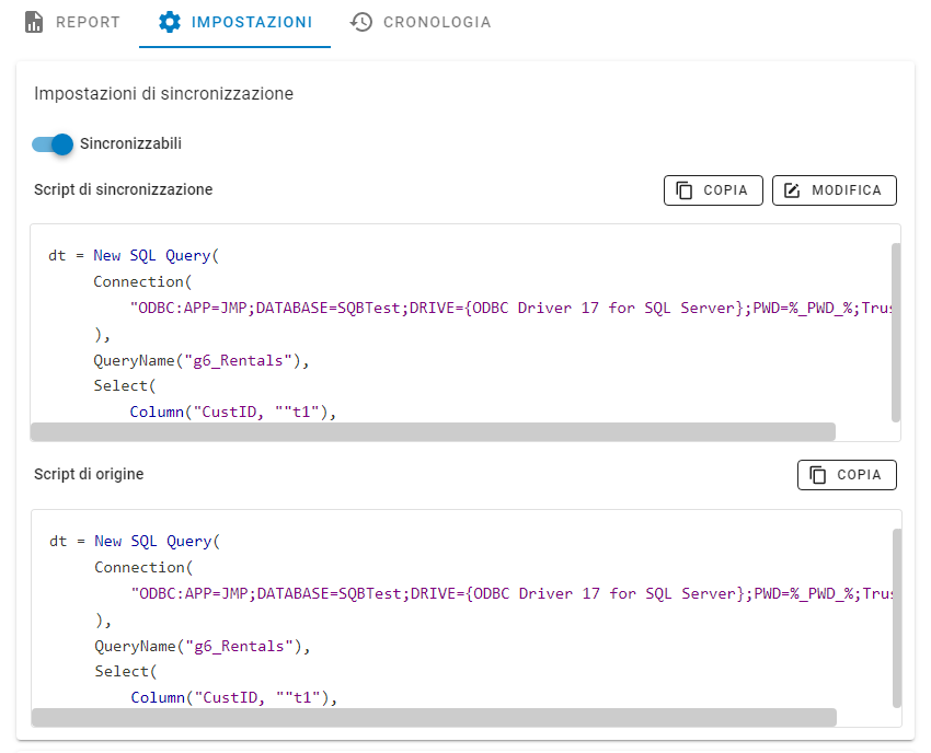 Suggerimento: Per visualizzare i risultati di una sincronizzazione, fare clic sulla scheda Cronologia. È possibile vedere quando lo script è stato eseguito e se ha avuto esito positivo.