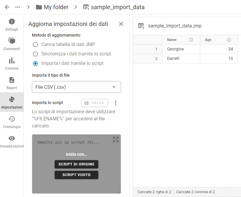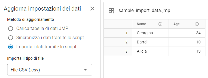 Suggerimento: Prima che un utente possa importare i dati, un amministratore dei dati deve impostare il metodo di aggiornamento e creare uno script. Consultare Creazione di uno script di importazione.