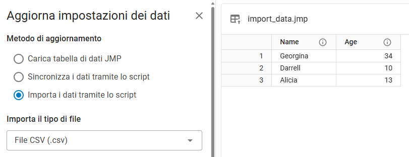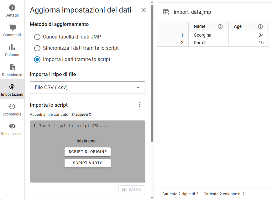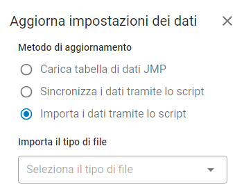 Nota: Questa opzione appare solo se si seleziona la voce Aggiorna o Importa dati tramite script.