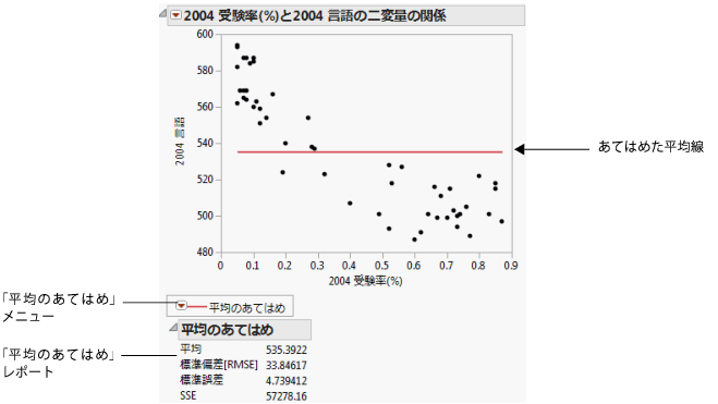 の平均を示す水平線が、散布図に追加されます。平均の水平線は、他のあてはめ(直線、信頼曲線、多項式曲線などのあてはめ)と比較するための参照線として使えます。
