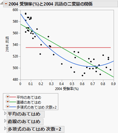直線や多項式のあてはめは、平均線、回帰直線、2次多項式を比較したものです。
