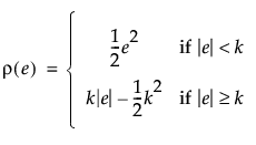 [ロバストなあてはめ]オプションで用意されている手法は、応答変数の外れ値が推定結果に与える影響が少ないものです。HuberのM推定が使用されます。HuberのM推定では、次式により定義されるHuberの損失関数を最小にするパラメータ推定値を見つけます。