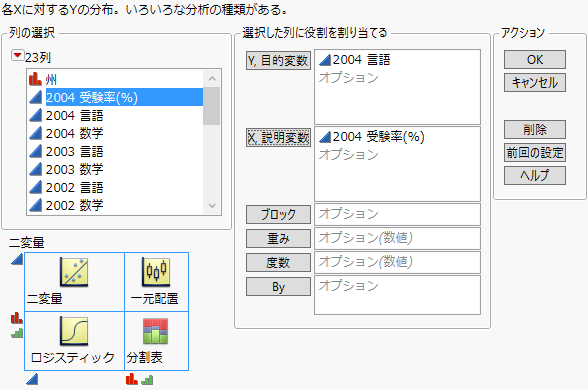 連続尺度の列を選択し、[X, 説明変数]をクリックします。