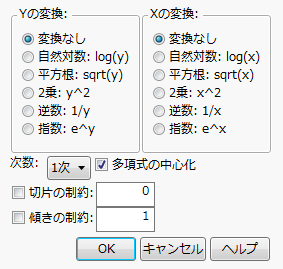 「二変量の関係」の赤い三角ボタンをクリックし、メニューから[その他のあてはめ]を選択します。「変換または制約を指定」ウィンドウが表示されます。このウィンドウの説明については、第 “その他のあてはめ”を参照してください。