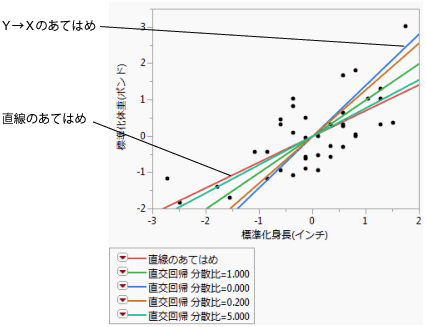 「直交のあてはめ」のオプション例の散布図は、「身長(インチ)」と「体重(ポンド)」を標準化し、いろいろな直線をあてはめたものです。分散比を変化させたときの「直交のあてはめ」の様子がわかります。X変数の分散をゼロとした場合は、普通の回帰直線です。その対極にあるのがXのYへの回帰で、そこではY変数の分散をゼロとしています。他の直線は、これら2つの間に位置し、分散比に応じて少しずつ傾きが変わっています。分散比が大きくなるにつれて、Yの変動だけが考慮されるようになり、直線の傾きがYのXへの回帰直線(普通の回帰直線)に近付きます。逆に、分散比を小さくすると、直線の傾きはXのYへの回帰直線に近付きます。