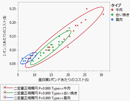 グループ別の例は、異なる種類のホットドッグの確率楕円を、コストを変数としてプロットしたものです。種類ごとに点がクラスターを形成しているのがわかります。