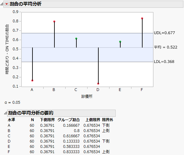 この例では、「Office Visits.jmp」サンプルデータを使用します。このデータには、ある地域の6 つの診療所において、予約どおりの時間に患者が診察できたかどうかが記録されています。6つの診療所ごとに、1週間分のデータから、60の診察予約データを無作為抽出しました。予約時間から5分以内に診察室に通された場合には、定刻どおりの診察とみなします。予約時間どおりに診察を受けた患者の割合を調べてみましょう。