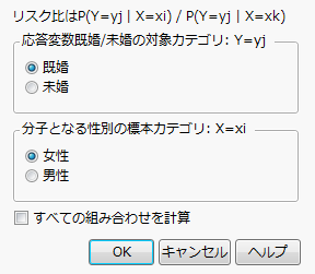1対の応答と因子についてのみ相対リスクを計算するには、このダイアログボックスで対象の変数を指定します。たとえば、「相対リスクカテゴリの選択」ウィンドウのウィンドウで[OK]をクリックすると、次のように計算されます。
