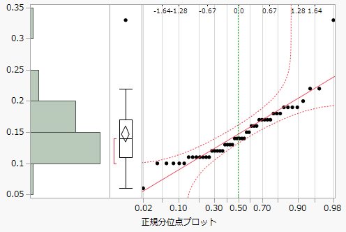 正規分位点プロットには、Lillieforsの信頼限界(Conover 1980)、確率スケール、正規分位点スケールも表示されます。