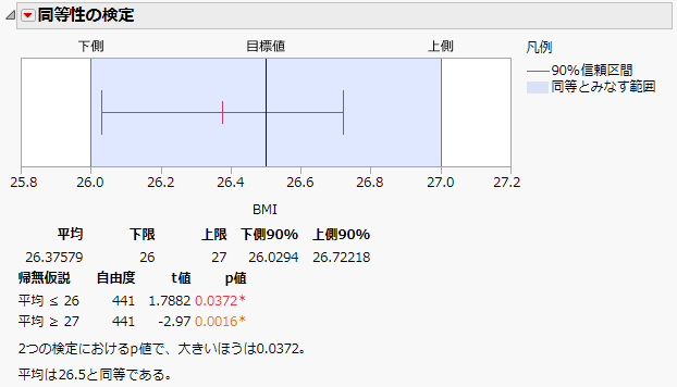「同等性の検定」レポートの「同等性の検定」レポートは、「Diabetes.jmp」サンプルデータの「BMI」変数に対して実行したものです。仮説平均は26.5、差の閾値(実質的に0とみなす差)は0.5と指定されています。
