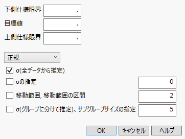 メモ: 正規分布以外の分布を指定した場合、シグマに関する指定は無効になります。あてはめた分布のレポートに「分位点シグマ」レポートが表示されます。このレポートでは、あてはめた分布の分位点から各指数が計算されています。あてはめることができる分布およびその「パラメータ推定値」レポートのパラメータについては第 “連続分布のあてはめ”と第 “離散分布のあてはめ”を参照してください。