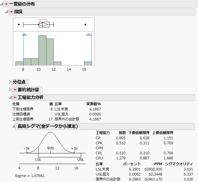 「酸度」の横にある赤い三角ボタンをクリックし、メニューから[工程能力分析]を選択します。