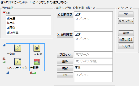 「二変量の関係」プラットフォームを起動するには、[分析]>[二変量の関係]を選択します。