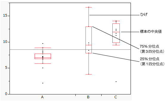 どの箱にも両端にひげと呼ばれる線が付いています。ひげは、箱の端から、次の式で計算された範囲内で最も遠くにある点まで伸びています。